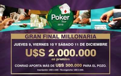Conrad Poker Tour 2010 tendrá su final apartir del jueves 9 de diciembre con el clasico Torneo del Millón en donde participarán jugadores de todo latinoamerica, el buy-in es de 2,500 dólares con la posibilidad de hacer una recompra por el mismo valor. El Casino aporta u$s 300,000 y se estima que el pozo de premios será superior al millón de dólares.